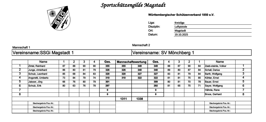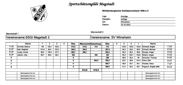 Die neue Saison startet gut für die Magstadter Schützen. Das Team um Christhard Junge gewinnt mit 2,8 Ringen Vorsprung den ersten Wettkampf 2025/26 gegen Dachtel in der Landesliga. Christhard Junge 315,5 Ringe- Franz Faschko 313,0 Ringe- Elsbeth Faschko 311,2 Ringe sorgten für den ersten Sieg. Nicht in die Wertung schaffte es dieses mal Ursula Junge 308,2 Ringe.